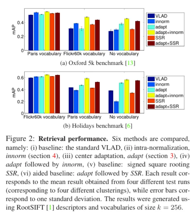 저자가 제안하는 Intra-normalization은 local descriptors를 clustering한 후 cluster마다의 잔차 합을 독립적으로 L2 정규화를 적용하는 방법입니다. 그리고 기본 VLAD나 앞서 설명한 SSR 와 동일하게 이후 전체 벡터에 대해서도 L2 정규화를 진행합니다. 해당 방법의 경우 bursty 한 element을 효과적으로 억제합니다.