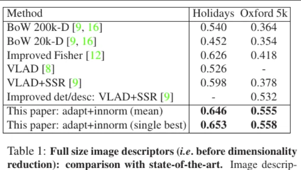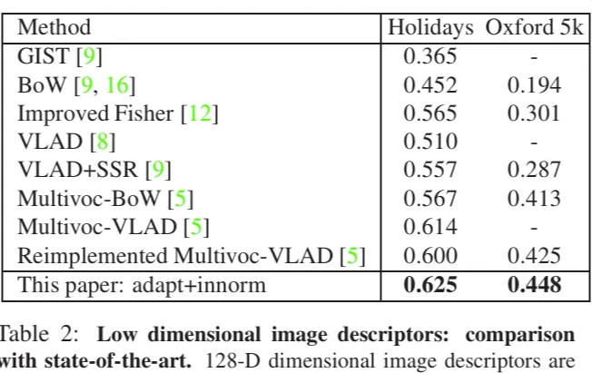 한 이미지에 대해 여러 vocabulary 마다 여러 VLAD 벡터를 계산하고 이렇게 증가된 차원을 PCA와 화이트닝 연산으로 차원을 축소한 것에 대해서 기존 메소드와 retrieval 성능을 비교한 실험입니다. Oxford 5k에 대한 실험에서는 Paris vocabulary를 사용합니다. (하나의 데이터셋으로도 여러번 clustering을 진행하게 되면 서로 다른 vocabulary를 얻게 되는데 이를 가지고 VLAD 벡터를 계산하는 것이 Multivoc 기법입니다.) Holidary 에 대한 실험에서는 Flickr1M 데이터셋에서 마지막 10k개의 이미지를 가지고 vocabulary를 생성하고 PCA를 학습합니다. 실험 결과 SoTA인 방법 보다 각각 5.4%, 1.8%의 성능 향상을 보였습니다. 본 연구에서 제안하는 adapt + innorm의 방법을 사용했을 때 벡터의 차원을 줄여도 기존 방법보다 성능이 우수하다는 것을 확인할 수 있는 실험이었습니다.