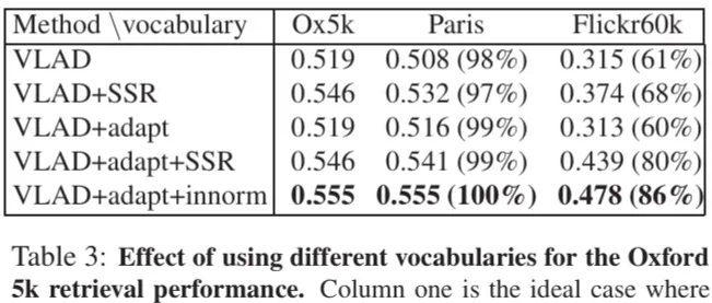 Table 3. 실험에 대해 조금 더 설명을 드리면요 Oxford 5k 데이터셋의 이미지에 대해서 서로 다른 vocabulary를 사용하면서 cluster center의 inconsistency 문제를 확인하고 adapt를 사용했을 때 이 문제가 보완이 되는가를 확인한 실험입니다. 첫 colum은 retrieval 데이터셋과 동일한 데이터셋으로 vocabulary를 구성한 것이고, Paris vocabulary는 다른 데이터셋이지만 건물 이미지란 점에서 상당히 비슷합니다. 반면 Flickr60k 데이터셋은 Oxford 5k와는 많이 다른 데이터셋입니다. 그래서 table에도 확인할 수 있듯 Ox5k, Paris, Flickr 순으로 성능이 낮아지는 경향을 띄고있습니다.