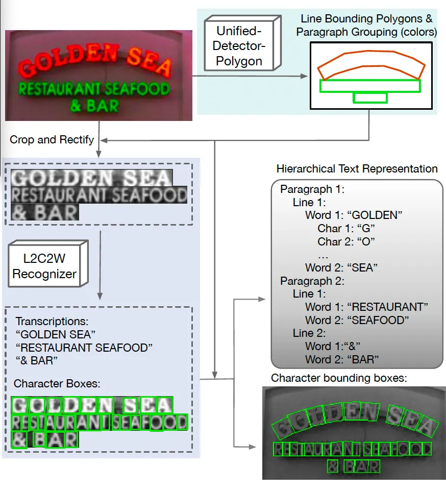 하지만, word-level이외의 구분 방식으로 접근한 연구가 처음은 아닌데요. Unified Detector라고 해서 text를 line-level로 detection하거나 서로 관련있는 text line을 묶어 문단으로 묶는 것까지 수행하는 모델이 존재합니다. 하지만, 이 Unified Detector는 오직 detection만 가능하고 recognition은 수행하지 않는 모델이기에 text가 존재하는 위치까지는 알려주지만 그 text가 정확히 어떤 글자인지, 혹은 character다 word 단위로 다시 분리해주는 기능까지는 없다고 볼 수 있죠.