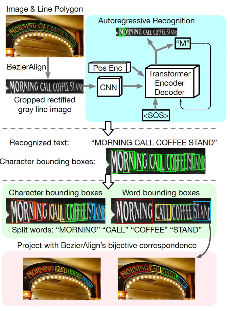 위 그림을 보면 전체적인 흐름을 파악할 수 있습니다. 간단히 말하면, text line level로 잘라낸 영상을 입력으로 받아 character level의 recognition과 word level의 grouping을 동시에 해내는 구조입니다. 먼저 입력은 원본 영상에서 BezierAlign을 사용해 crop하고 rectification(평평하게 펴주는)까지 거친 text line 영상이구요. 모델은 이에 대해 우선 character level의 prediction을 수행합니다.