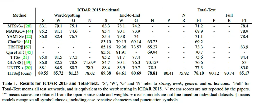 실험 결과를 보시면, ICDAR2015에서 제안된 HTS는 sota 방법론은 UNITS보다 더 좋은 성능을 보입니다. 다만 N이라고 적혀있는 non-lexicon인 경우에서는 UNITS와 유사한 성능을 보이네요. 여기서 non-lexicon이라고 하면 단어 사전 없이 성능을 평가한 것인데 S, W, G는 각각의 lexicon이라고 하는 단어 사전 내에서 edit distance가 가장 짧은 단어를 선택해 gt와 비교하는 식으로 평가가 수행됩니다. 또 spotting외에 e2e에서도 모든 lexicon에 대해 HTS가 더 좋은 성능을 보이고 있습니다. 여기서 볼만한 점은 UNITS라고 하는 모델은 추가적으로 TextOCR이라고 하는 외부 데이터를 가지고 학습을 했다는 점으로, HTS는 외부 데이터 없이 더 좋은 성능을 달성한 것으로 보아 제안하는 방식의 유효성을 시사합니다.