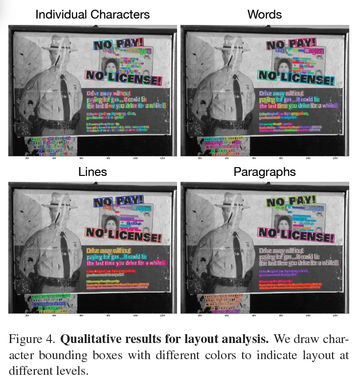 이번에는 제안된 HTS 모델이 image안에 있는 text의 layout 구조를 얼마나 잘 추정하는지에 대한 실험입니다. 위 FIg4를 살펴보면 character부터 해서 word, line, paragraph level로 layout을 분석하고 있음을 확인할 수 있습니다.