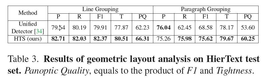 추가적으로 HierText라고 하는 데이터셋을 사용해 geometric layout analysis 성능을 정량적으로 평가하였습니다. 위 Table3을 보시면 제안된 HTS가 기존 베이스로 삼은 Unified Detector 대비 line grouping에서 4정도 paragraph grouping에서 6정도 더 높은 Panoptic Quality를 보입니다. 이 Panoptic Quality는 precision과 Tightness(일치정)을 둘 다 고려한 평가 지표입니다.