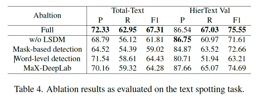 이어서 table4를 보시면 그 아랫줄에 mask기반의 output과 polygon 기반의 output 차이를 비교한 실험이 보입니다. 기존 베이스로 삼았던 Unified Detector 모델의 경우 mask를 가지고 text를 검출했지만 HTS는 bezier polygon을 예측하도록 했었죠. 둘을 비교하면 TT데이터셋에서는 F1score가 8% 이상 떨어졌고 HierText에서는 약 3% 하락한 것을 보입니다. TT데이터셋이 HierText에 비해 곡선이나 여러 모양을 가진 text가 주로 존재하는 데이터셋인데, 이 mask만을 가지고 detection할 때는 곡선 text를 다루는데 있어 crop이나 rectification이 어려워 성능 하락을 가져온 것이라고 볼 수 있겠습니다.