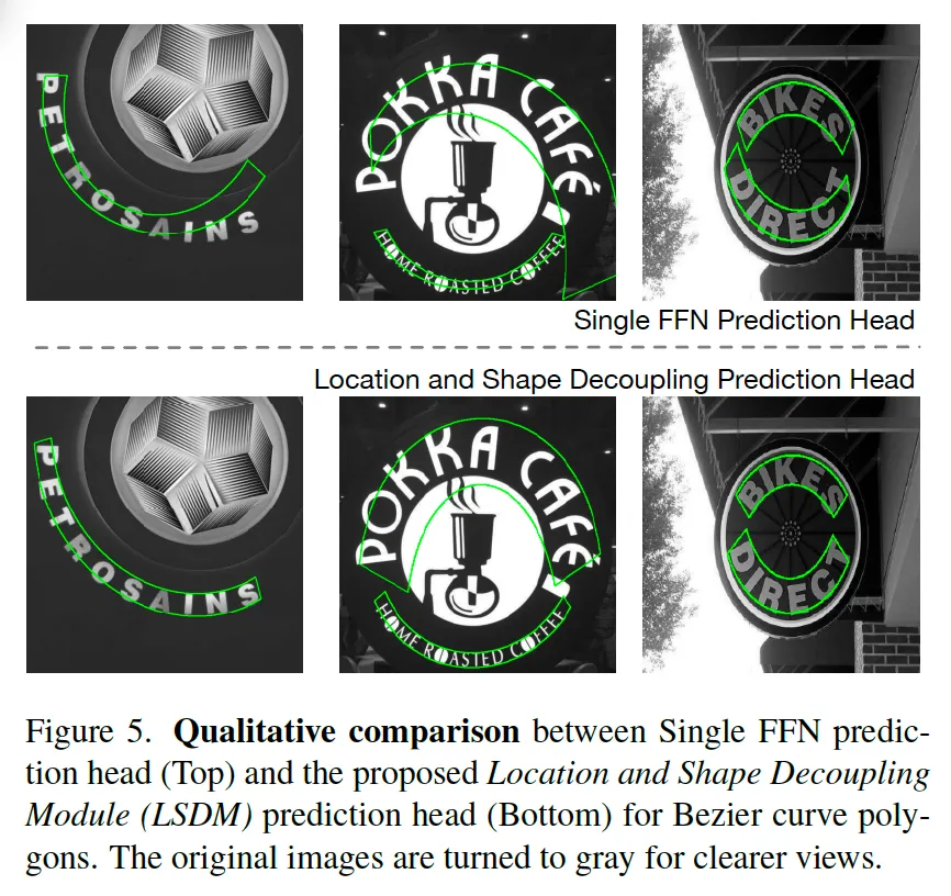 Table4에는 본 논문에서 제안된 여러 모듈들을 추가해가면서 성능을 확인한 실험 결과를 담고 있습니다. 먼저 맨 위에 LSDM같은 경우는 Location and Shape Decoupling 모듈로써 단일 FFN을 사용하는 것보다 이를 두 역할 location과 shape을 예측하는 각각으로 나눔으로써 학습하는 모듈이었죠. 이걸 제거하고 단일 FFN branch를 통해 바로 global bezier를 예측하도록 했더니 F1score가 각각 5.5%, 4% 정도 하락한 것을 볼 수 있습니다.