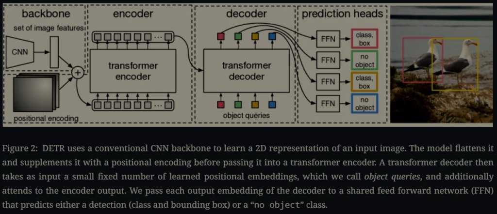 객체 검출은 객체에 대한 바운딩 박스와 해당 객체가 포함되는 클래스를 예측하는 하나의 set prediction 문제라고 볼 수 있는데요. 기존 연구들이 이러한 문제를 다룰 때 제안하는 방법들은 대부분이 region proposal, anchor box, window center등을 설정하고 이어서 NMS 같이 중복 예측을 제거하는 중간과정이 필요하며 이를 위해 사람의 개입이 요구됩니다. 논문의 저자는 이러한 문제를 지적하며 저자는 이 과정을 단순화한 DEtection TRansformer를 (이하 DETR) 제안합니다. 이렇게 end-to-end하게 예측하는 방법은 다른 도메인에서는 꾸준히 시도되어 왔지만 객체 검출 분야에서는 본 연구가 처음이라고 합니다. (비슷한 시도를 한 연구도 있었지만 대부분이 새로운 prior knoledge 방법을 사용하거나 기존 베이스라인 모델보다 우세한 성능을 보이지 못했다고 합니다. 본 연구는 이런 연구들과는 달리 postprocessing이나 어떠한 다른 prior knoledge를 필요로 하지 않으면서도 베이스라인 모델의 성능보다 우세한 결과를 낸 방법입니다.)