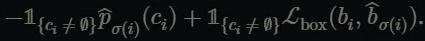 여기서 c_{i}는 객체에 대한 class label이 되고 bi는 (cx, cy, w, d) 으로 바운딩 박스의 좌표를 나타냅니다. 시그마 i로 매칭이 되었을 때 각 매치의 matching loss는 다음과 같습니다.
