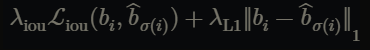 기존 detection에서 사용되는 box loss와 해당 연구에서 헝가리안 loss로 사용되는 box loss 정의가 조금 다른데요. 단순히 l1 loss로 박스의 좌표간의 거리를 loss로 정의했을 때 객체 크기에 따라 상대적으로 오차의 정도가 달라진다는 문제를 지적하며 l1 loss와 generalized iou loss를 선형적으로 결합해 scale invariant한 새로운 loss를 box loss로 제안합니다. 수식은 다음과 같이 정의됩니다.