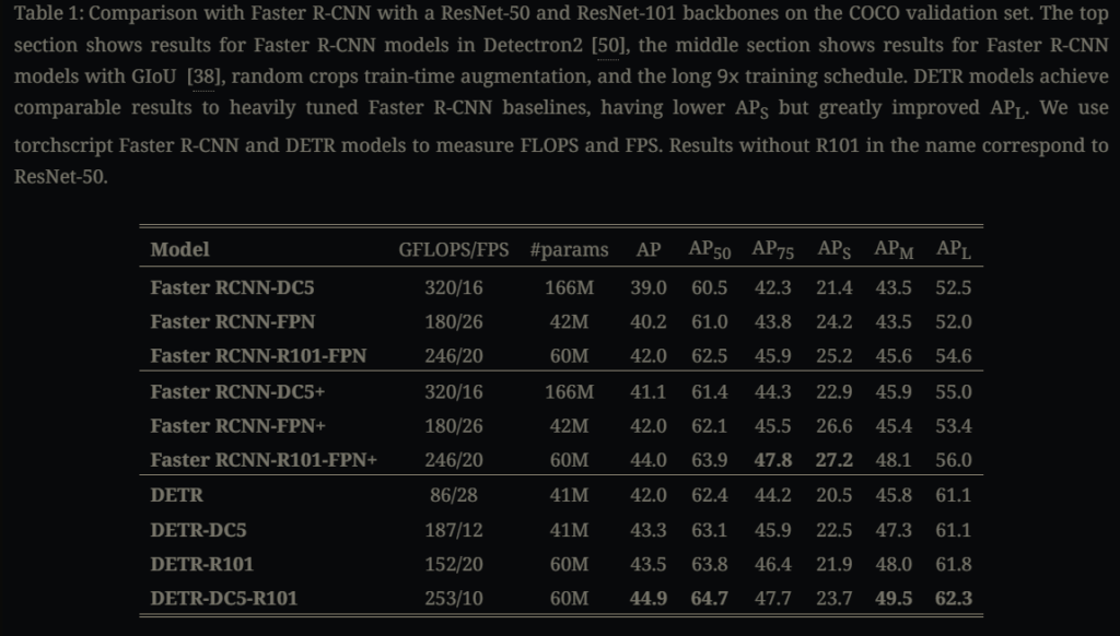 기존 SoTA인 Faster R-CNN과 COCO 데이터셋에 대해 성능 비교를 한 결과 DETR이 꽤나 겸줄만한 결과를 냈다고 합니다. 이에 대한 정량적인 지표를 살펴보겠고요 또한 DETR에 대해 여러 ablation 연구가 진행되었는데 이에 대해서도 하나씩 살펴보겠습니다.