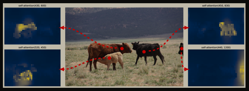다음은 인코더의 마지막 레이어에서의 attention map을 시각화한 것인데요 일부 영역에 집중돼 있는 것을 보아 인코더에서 부터 객체 간의 구분이 이뤄졌다고 볼 수 있을 것 같습니다.