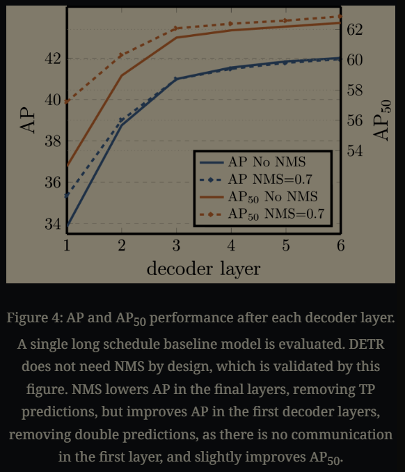 NMS를 추가했을 때 초기 레이어에서는 NMS가 없는 방법보다 AP가 높지만 decoder layer를 추가적으로 더 통과하고 나서는 그 차이가 줄어들고 NMS 없이도 비슷한 성능을 낸다는 것을 확인할 수 있습니다. 고로 NMS 없이도 정확하게 GT와 모델의 예측이 잘 매칭되고 학습이 되었다고 볼 수 있겠지요?