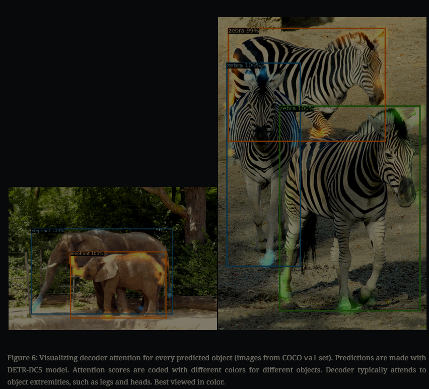 다음은 앞서 인코더에서도 확인한 것과 동일하게 디코더 레이어에서의 학습된 attention map을 이미지위에 각 객체마다 색이 다르게 시각화한 것인데요. 인코더에서는 전역적으로 각 객체를 구분하기 위해 객체가 이미지 속 차지하는 영역 전체가 attention 값이 컸다면 decoder에서는 객체에 대한 구분이 어느정도 된 후 정확한 객체의 바운딩 박스를 치기 위해 객체의 바운더리 영역이 조금 더 집중되고 있다는 것을 알 수 있습니다.