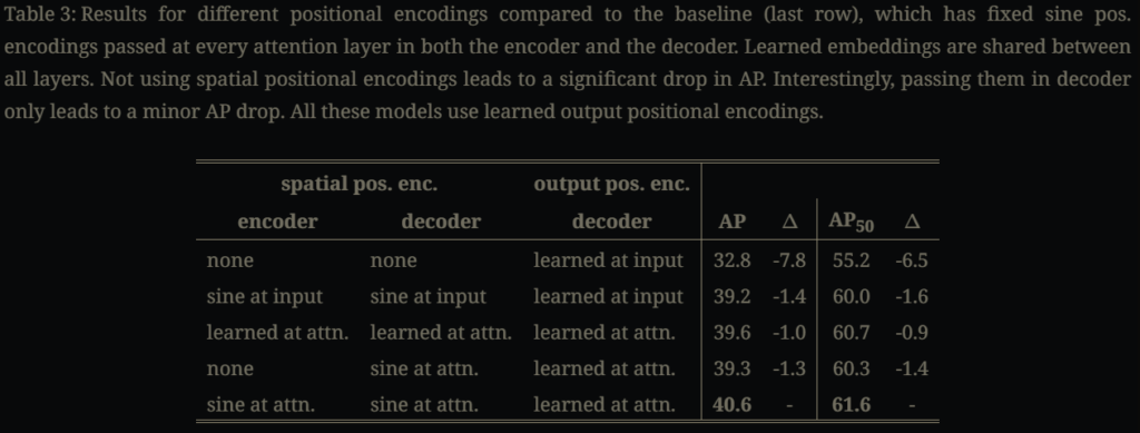추가적으로 DETR에는 두가지 종류의 positional encoding이 더해지는데 ( feature map에서의 위치 정보 보존 위한spatial encoding, 디코더에서 각 object 쿼리마다 집중하는 객체를 구분하기 위해 더해지는 output positional encoding) 이에 대한 ablation 결과는 다음과 같습니다. spatial positional encoding이 없어도 성능이 아예 나오지 않는 것은 아니지만 성능 하락 폭이 큽니다. 인코더, 디코더에 모든 레이어 마다 spatial positional encoding과 output positional encoding을 더했을 때가 제일 결과가 좋습니다.