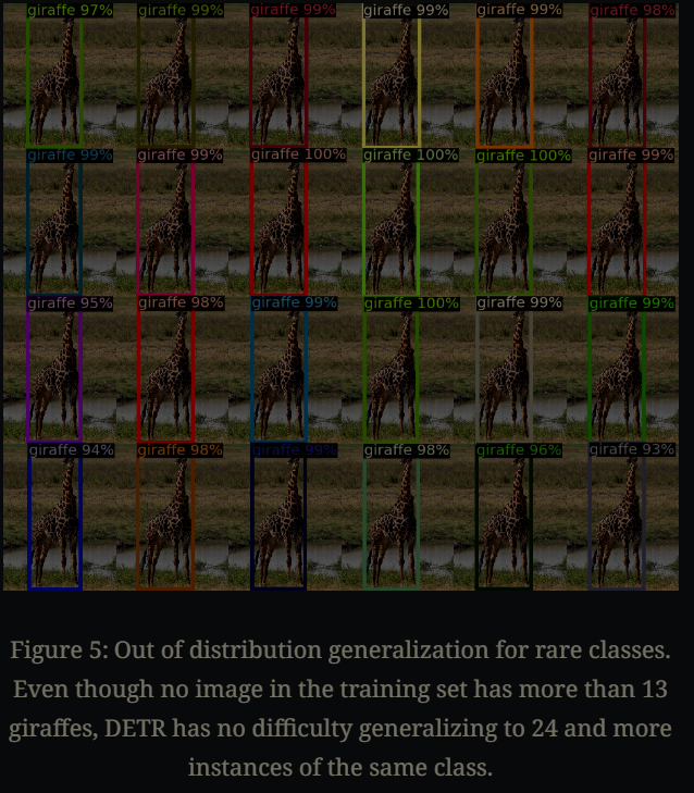 또한 추가적인 실험이 하나 더 있는데요.. 꽤나 흥미롭습니다. 데이터셋에 같은 객체가 여러번 (15회 이상) 나오는 경우는 없다보니 학습을 통해 쿼리 마다 특정 객체에 대해서만 잘 학습도록 돼 있지 않을까 싶기도 한데요 그래서 저자는 기린을 여러번 복사해서 모든 쿼리에서도 기린으로 예측된 것을 보여 DETR에는 class-specialization이 있지 않음을 확인하였습니다.