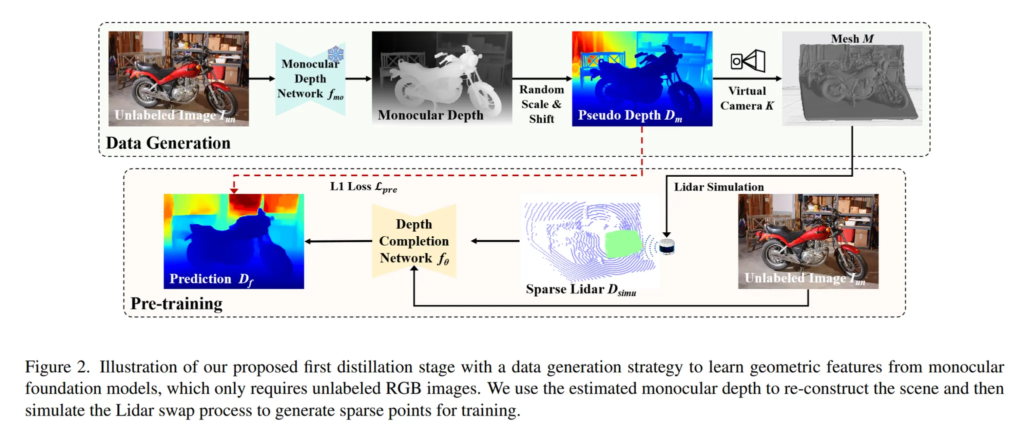 이를 효과적으로 활용하기 위해 본 논문에서는 MDE에서 depth completion 모델로 기하학적인 knowledge를 distillation하는 새로운 2-stage distillation 프레임워크를 제안합니다. 먼저 첫번째 distillation 단계에서는 MDE를 통해 데이터를 만든 다음에 제안하는 사전학습 방식을 통해 knowledge를 distillation합니다. 좀 더 자세히 말해보면 MDE를 통해 pseudo depth map을 만들고, 무작위로 샘플링한 카메라 파라미터를 사용해서 scene을 재구성하여 라이다 데이터를 만드는 것이죠.