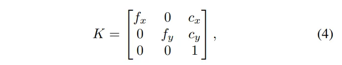 그 다음에는 실제 라이다 dense map을 대신할 데이터로 만들기 위해 카메라 내부 파라미터를 식(4)와 같이 무작위로 생성합니다.