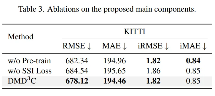 다음은 Tab.3에서 두번째 행에 대한 결과인데요, 사전학습은 논문에서 제안하는대로 그대로 하되, 두번째 distillation 단계에서 SSI loss를 제거하였을 때의 결과를 나타냅니다. 결과적으로 제안하는 SSI loss가 단순히 사전학습하고 depth completion 네트워크를 데이터셋이 제공하는 GT를 사용하여 학습하는 것보다 성능 향상에 도움이 된다는 것을 보여주고 있습니다. 이를 통해 논문에서 가장 강하게 contribution으로 어필하는 만큼 MDE depth를 사용하면서도 절대적인 metric depth 스케일에 맞추도록 설계한 SSI loss가 성능에 크게 영향을 미친다는 것을 알 수 있습니다.