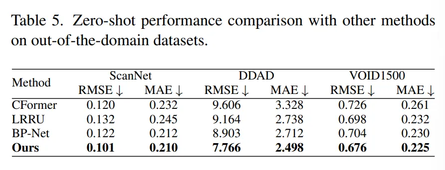 Tab.5의 ScanNet, DDAD 그리고 VOID1500은 사전학습과 fine-tuning에서 모두 한번도 사용하지 않은 unseen 데이터 입니다. 타 방법론 대비 RMSE와 MAE 메트릭에서 모두 가장 좋은 성능을 보이고 있고, 특히 DDAD 데이터에 대해서 가장 큰 차이를 보이고 있습니다. DDAD 데이터셋도 ScanNet과 마찬가지로 outdoor 데이터인데요, 어떤 차이로 인해서 DDAD에서 특히나 큰 차이를 보이면서 성능 개선이 되었을지에 대해서는 별다른 언급은 없지만 어쨌든 OOD 세팅에서 좋은 결과를 보이면서 주장했던 일반화 성능이 타 방법론들에 비해 잘 이루어졌다는 것을 확인할 수 있는 결과 입니다.