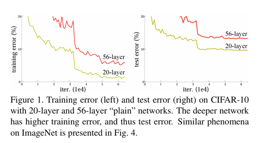 하지만 gradient-based optimizer 입장에서는 이 커진 공간 안에서 identity를 근사해야 하는 것은 훨씬 어려운 문제입니다. 저자는 그 이유로 plain 구조에서는 nonlinear layer가 쌓이면서 “거의 아무것도 안하는 층”을 만드는 것이 매우 어렵기 때문이라고 표현헀습니다.