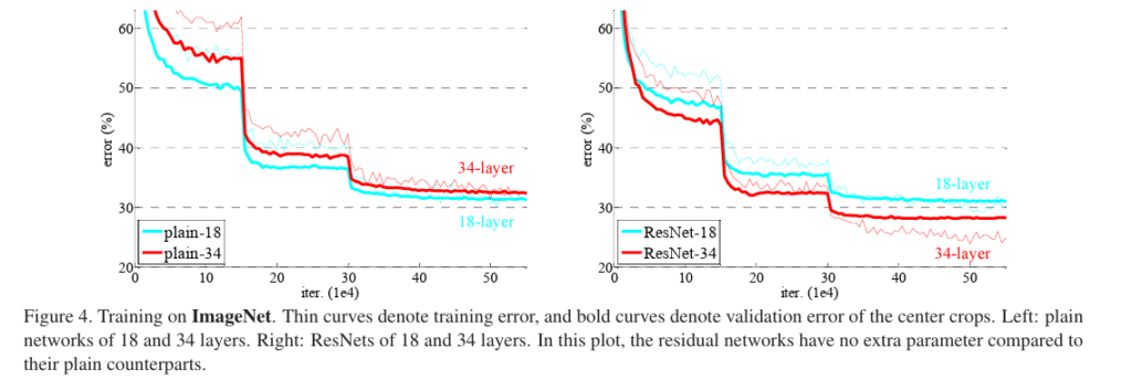 Plain과 ResNet을 비교함으로써 Degradation problem을 확인하고 ResNet이 이를 해결하는 점을 보였습니다.