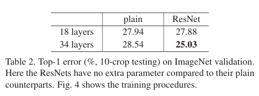 Top-1 error 성능은 18layers 에서 plain과 ResNet은 별 차이가 없지만, 수렴속도는 차이가 납니다. 위의 Figure 4 그래프를 보면 같은 iteration 에서 초기 error 성능이 더 빠르게 낮아지는 것을 볼 수 있습니다.