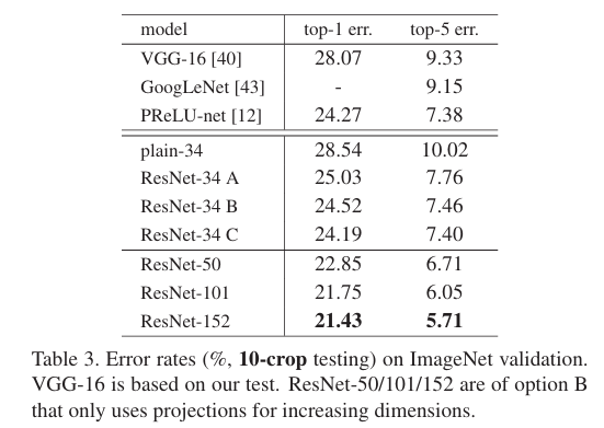 다만 projection shortcuts가 degradation problem을 해결하는 주 역할이 않고 학습 속도만 느려지므로 저자는 B를 채택했다고 합니다.
