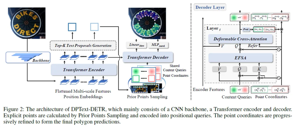 TESTR와 동일하게 Deformable-DETR을 기반으로 해서 모델이 설계됩니다. DPText의 구조는 다음 구조도로 확인하시길 바랍니다.