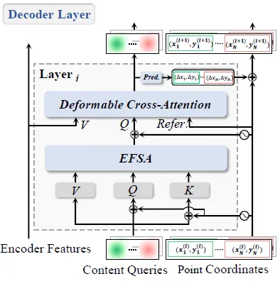 디코더 블록마다 뒷단에 prediction head를 통과해 오프셋이 계산되는데요 이를 토대로 각 point query가 업데이트 됩니다. TESTR의 경우 디코더의 인풋으로 들어가는 control point query에 한번 더해졌던 것과는 달리 매 레이어 마다 업데이트된 point query가 content query에 더해져 이후 attention이 수행됩니다.