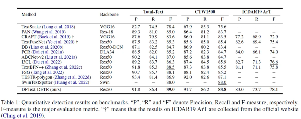 3개의 데이터셋에 대해 기존 모델들과의 검출 성능을 비교한 표가 되겠습니다. Precision과 Recall의 조화평균값인 F 지표를 기준으로 설명하면 3 데이터셋에 대해서 DPText의 성능이 제일 우수했습니다.