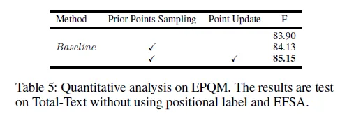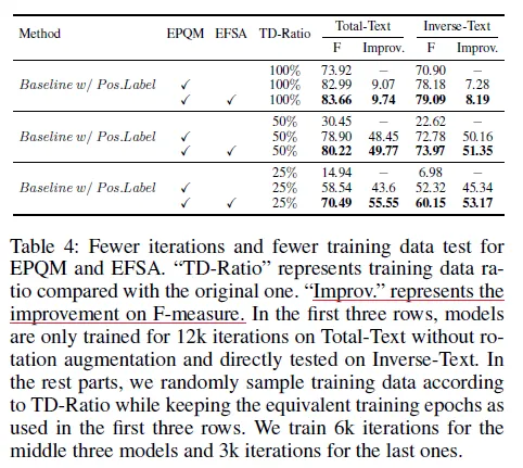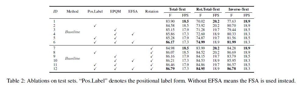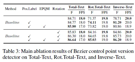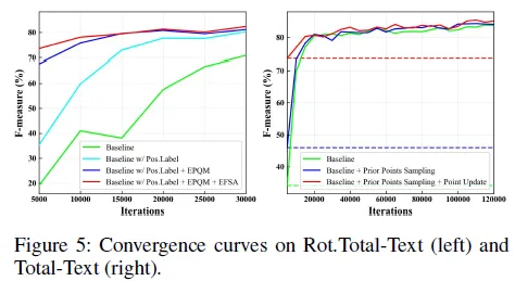 Figure 5를 참고하시면 베이스라인에 positon label을 적용한 방법에 추가적으로 EPQM까지 더했을 때 수렴이 더 빨리 이루어 졌습니다. Table 3을 참고했을 때 Rotation 증강을 적용한 것과 하지 않은 것 모두 그리고 세개의 데이터셋에 대해서 성능 향상을 확인할 수 있었습니다. 다만 Rot.Total-Text, Inverse-Text에서 EPQM을 적용하지 않고 Positon label만을 사용했을 때의 성능이 조금 더 높았습니다. 그 점 참고해주세요.