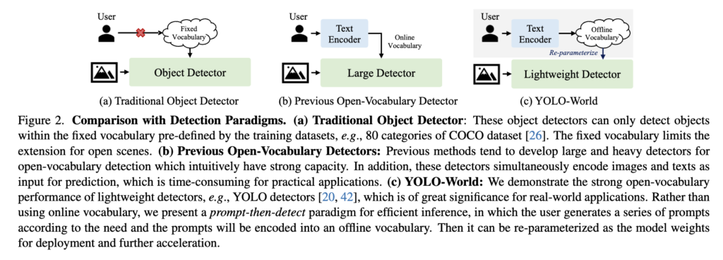 위와 같은 문제점을 해결하고 real-time에서 좋은 성능을 내고자 YOLO-World가 등장했다고 보시면 될 것 같습니다. 위에 첨부한 Figure 2 (c) 파트 설명부분에 논문에서 말하는 YOLO World가 real-time에서 좋은 성능이 나타날 수 있는 핵심이 나타나있는데요.