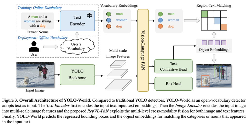 YOLO-World 논문에서는 inference 시 텍스트를 미리 임베딩하여 오프라인 vocabulary를 구성하고, 이를 모델 가중치로 re-parameterize하여 사용하는 것이 속도 향상에 결정적인 기여를 한다라고 언급되어있습니다.