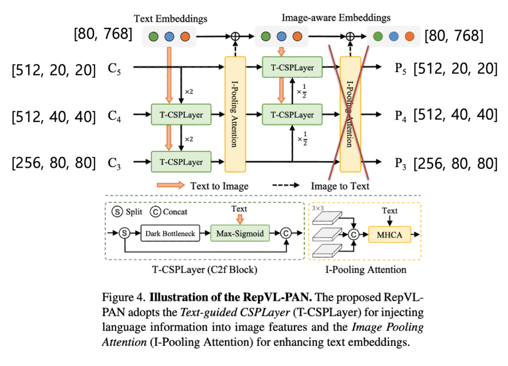 위는 RepVL-PAN의 구조입니다. 큰 틀에서 보면 먼저 backnone을 타고 나오는 피쳐맵들과 text-embeddings를 입력으로 받아서 이미지 특징과 텍스트 특징 간 서로가 서로에게 중요한 정보를 반영하게 하도록하는 과정을 담당한다고 보시면 될 것 같습니다. 기존 PAN에서 사용한 top-down 및 bottom-up 경로를 따르고 multi scale feature maps {C3, C4, C5}을 입력으로 받아 중요한 텍스트 정보가 반영된 multi scale feature map {P3, P4, P5}을 출력으로 내뱉게 됩니다. 그리고 텍스트에 이미지 정보가 반영된 Image-aware Embeddings가 출력으로 나오게 되는 것을 보실 수 있습니다. 각각 출력이 어떻게 나오는지 조금 더 자세하게 설명을 드리겠습니다.