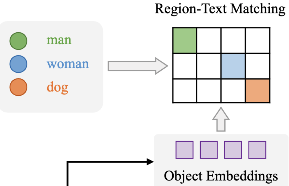 먼저 간단하게 OVOD가 제로샷 성능을 낼 수 있는지에 대해 간단하게 설명을 드리면 일반적인 OD처럼 각 클래스를 직접 학습하는게 아니라 이미지와 텍스트가 공통의 임베딩 공간에서 의미적으로 가까워지도록 학습합니다. 즉, ‘강아지’라는 단어와 강아지와 관련된 이미지가 같은 공간에서 가까운 위치를 갖도록 학습한다고 생각하시면 될 것 같습니다. 게다가 이미지와 텍스트가 공통의 임베딩 공간에 매핑하는 과정에서 대규모의 데이터로 학습된 모델을 사용하기 때문에 제로샷 예측이 가능하게 됩니다.