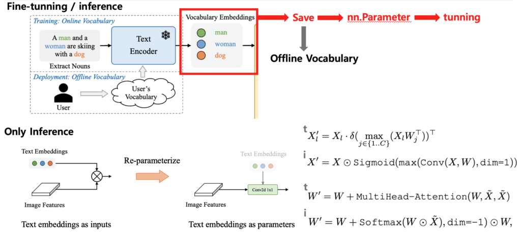 Re-parameterize는 앞서 만든 offline vocabulary를 활용해서 “텍스트 임베딩을 online vocabulary 입력으로 받는 방식” -> “텍스트 임베딩을 파라미터로 통합하는 방식”으로 전환하는 과정에서 위에 보이시는 그림과 같이 어떠한 복잡한 attention의 특정 연산의 구조를 Conv2d 1×1 연산 이나 단순한 요소별 곱 형태로 바꾸는 방식이라고 이해하시면 될 것 같습니다. 논문에서는 해당 내용에 대해서 엄청 깊이 있게 다루지 않아서 사실 해당 방식의 동작 메커니즘에 대해서는 아직 이해가 부족한 상태입니다.