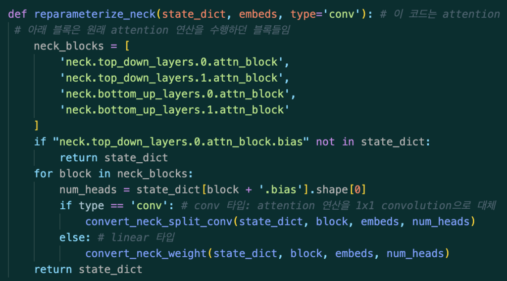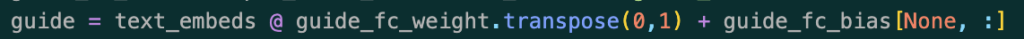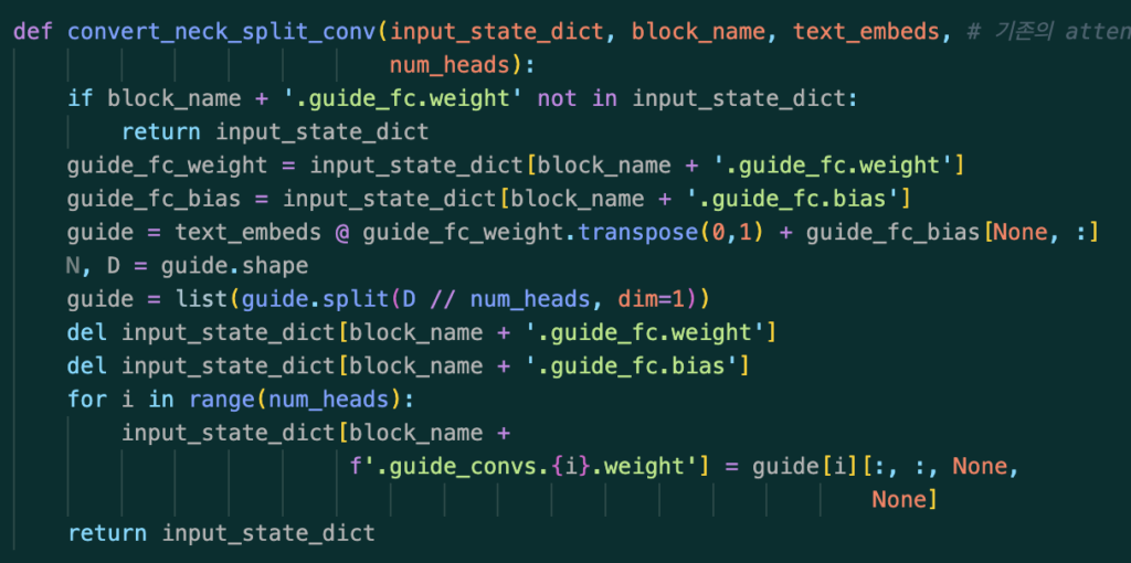 따라서 실제 inference 과정에서 모델이 객체를 탐지하기 전, Max-Sigmoid 블록 같은 경우에 실제로 위의 guide_fc라는 레이어의 가중치를 미리 뽑아와서 기존에 가지고 있던 text_embeds와 guide_fc의 가중치로 아래와 같은 방법으로 guide 계산을 진행을 합니다. 그리고 해당 guide 값을 기존의 attn_block을 지우고 새로운 Conv1x1의 가중치로써 사용하게 됩니다. (추론 과정에서는 저 guide_fc레이어를 통과시키지 않음. 지워진 상태)