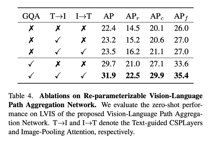 그리고 저자는 COCO 데이터셋에서 YOLO-World를 finetunning할 때에는, vocabulary size 가 작다는 점을 고려하여 제안된 RepVL-PAN 모듈을 제거하고, 추론 속도를 더욱 향상시켰다라고 언급을 하였는데, 이에 대한 결과도 테이블에서 확인 할 수 있습니다. 결국에 앞선 table 4를 보면 RepVL-PAN은 확실히 멀티모달 강화에 효과적이지만, 꼭 사용하지 않아도 성능이 매우 높기 때문에 조건에 따라 구조 선택이 가능하다는 것을 보여주는 것 같습니다.