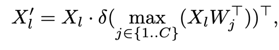 Max-Sigmoid 모듈을 나타내는 수식인데, 위 수식이 결국 의미하는 것은 X(이미지 피쳐)와 W(텍스트 임베딩 벡터들)간의 유사도를 계산하여 가장 유사도가 높은 값을 이미지 피쳐에 반영하겠다는 의미입니다.