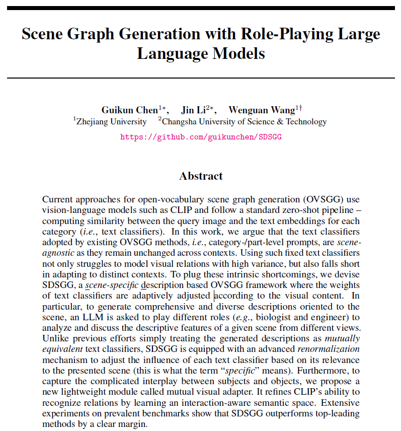 안녕하세요, 허재연입니다. 오늘도 Open-Vocabualry Scene Graph Generation(OV-SGG) 논문을 들고 왔습니다. 기존 OV-SGG 방법론들이 scene-agnostic하게 text classifier를 적용시킨 방식에 대해 문제를 제기하고, LLM을 적극적으로 활용하여 주어진 영상의 시각적 맥락에 따라 classifier가 동작할 수 있도록 한 SDSGG(scene-specific description based OVSGG)라는 프레임워크를 제안합니다. 살펴보겠습니다.