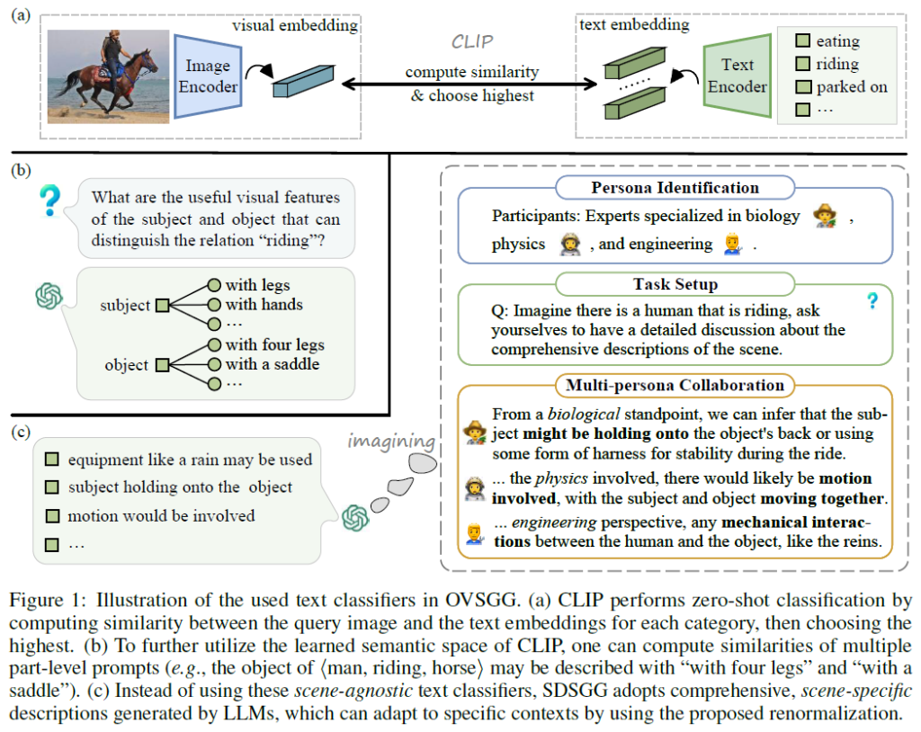 OVSGG는 최근 VLM 및 prompt learning의 등장에 힘입어 상당히 많이 발전되었습니다. 기존 OV-SGG방법론들은 다른 task에서 VLM을 활용해 OV를 활용하는 방법과 비슷하게 쿼리 이미지에서 얻은 visual embedding과 사전 정의된 text classifier에서 얻은 text embedding 간 유사도를 계산해서 비교하는 일반적인 zero-shot 방식으로 수행됩니다. 이 방법론들에서는 나이브하게 text classifier로 단순히 category name(예 : “riding”)을 사용하고 이후 prompt learning으로 vision-language alignment를 수행해서 기본적인 패턴을 학습합니다. 하지만 이런 방식으로 학습하면 language가 제공할 수 있는 추가적인 풍부한 문맥적 정보를 활용하지 못한다는 문제가 제기되었습니다. 이를 해결하기 위해 RECODE라는 방법론을 제안한 2023년 논문에서는 relation detection을 여러 구성 요소로 분해해서 object의 시각적 특징이 보다 세분화된 part-level description(description은 prompt라고 생각하시면 됩니다)과 얼마나 잘 매칭되는지를 비교해서 유사도를 계산하는 방법론을 제안했다고 합니다. 아래 Figure 1(b)에서 볼 수 있듯, “riding”이라는 relation의 object는 4개의 다리나 안장을 가져야 하는 것과 같은 느낌으로 받아들이시면 될 것 같습니다. Figure 1(a)에는 일반적으로 CLIP과 같은 VLM을 활용한 zero-shot 예측 수행 방법을, (c)에는 저자들이 제안하는 방법론을 나타냈네요.