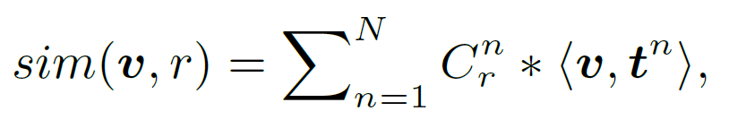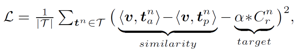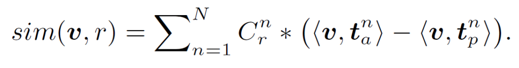 위 유사도 수식 내부의 <v, {t}^{n}_{a}>-<v, {t}^{n}_{p}>은 해당 SSD의 상대적 기여도를 정량화 합니다. 따라서 제시된 문맥과와 무관한 SSD는 <v, {t}^{n}_{a}>와 <v, {t}^{n}_{p}> 값이 거의 동일하기에 그 영향력을 줄일 수 있습니다.