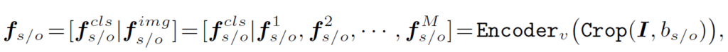 이미지 I와 주어, 목적어의 bounding box {b}_{s}, {b}_{o}가 주어졌을 때 CLIP visual encoder를 통해 visual embedding을 추출할 수 있습니다.