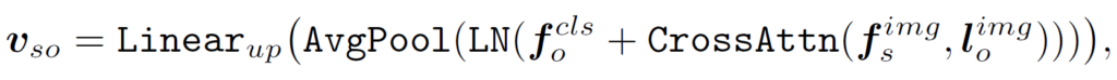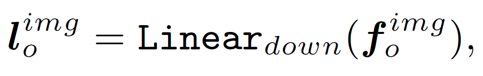 그 다음, MVA는 cross-attention 및 두개의 경량화된 projection module을 통해 {f}_{s}, {f}_{o}를 집계하는데 사용됩니다. 이 때 subject 부분을 쿼리로, object부분을 value로 설정합니다. 먼저 object의 패치 임베딩 {f}^{img}_{o}를 저차원 semantic space로 projection합니다.