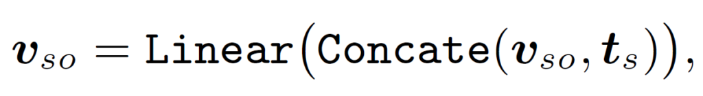 지금까지 본 MVA는 그 구조가 대칭적이고, 어떤 입력이 주어이고 목적어인지 구별시켜주는 별도의 정보가 없습니다. 저자는 이런 구조가 의미론적 관계에는 비교적 영향을 적게 미치지만, 기하적 관계를 모델링할때는 큰 영향을 미칠 수 있다고 합니다(예를 들어 주어와 목적어의 위치를 바꾸거나 이미지를 flip하면 ‘먹고 있다’ 같은 관계는 바뀌지 않겠지만 ‘ 왼쪽에 있다, 오른쪽에 있다, 위에 있다’ 같은 관계에는 영향이 가겠죠). 이를 보완하기 위해 추가로 “a photo of subject/object”라는 문장을 각각 임베딩한 text embedding {t}_{s}, {t}_{o}를 추가로 포함시켜 다음과 같이 visual embedding을 업데이트하였다고 합니다.