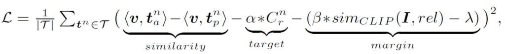 일반적으로 OV 세팅에서는 positive가 임베딩 공간에서 가깝게, negative가 임베딩 공간에서 멀어지게 학습하게 됩니다. SDSGG는 positive / negative가 category가 아닌 description 수준에서 정의되기 때문에 relation-description 간 연관에 따라 loss가 정의됩니다. labeled relation triplet이 주어졌을 때 가장 간단하게 contrastive loss를 정의하는 방법은 다음과 같다고 합니다 :
