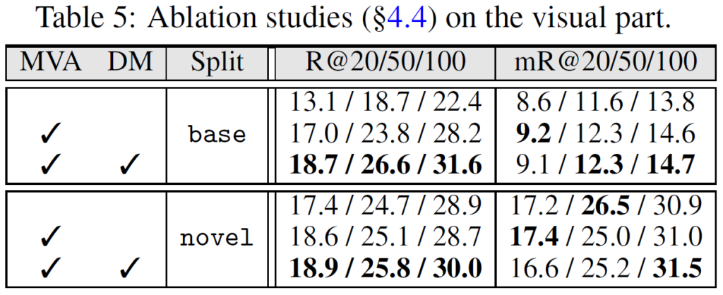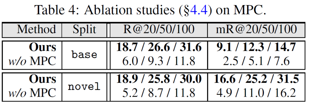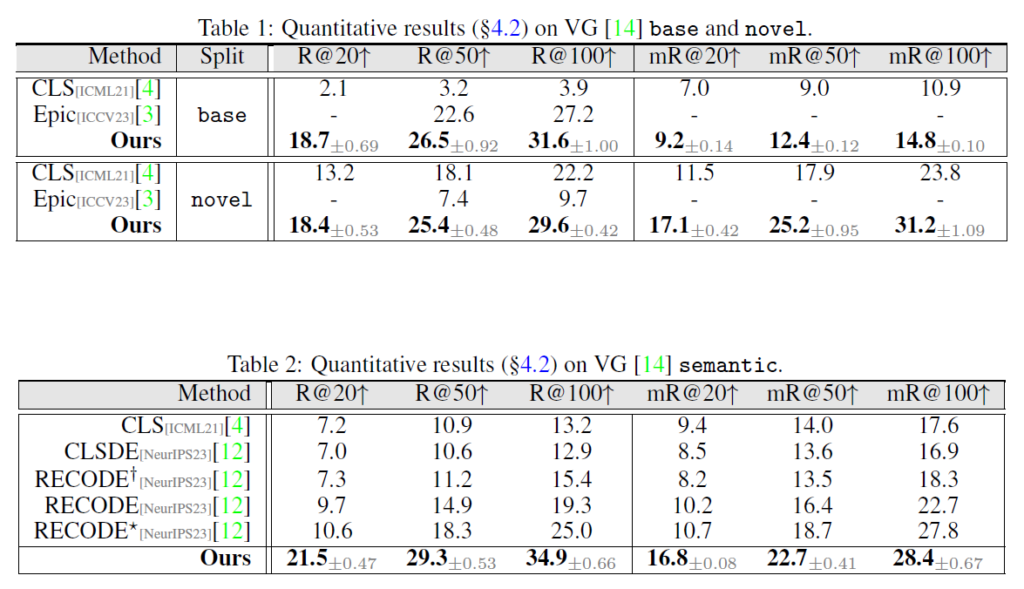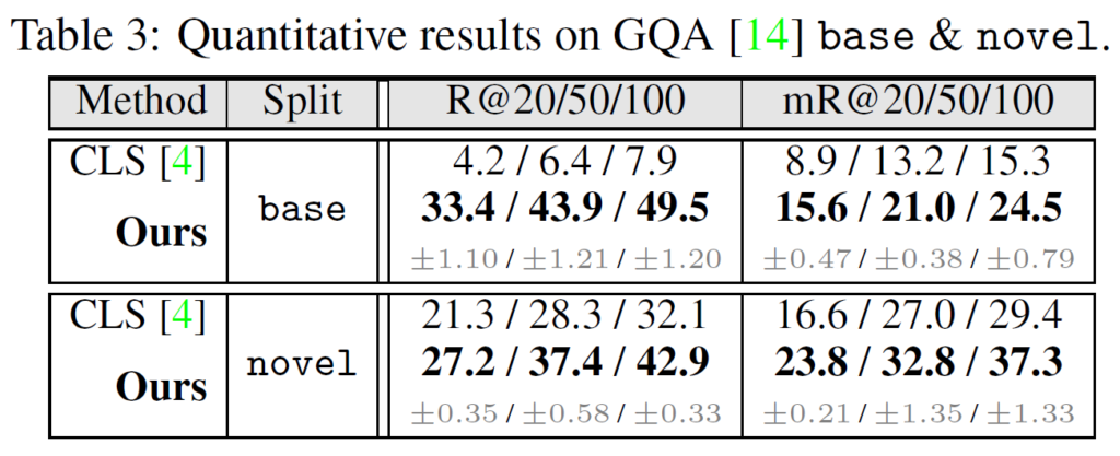 이전 연구들의 기조를 이어받아 벤치마크는 GQA와 VG에서 이루어졌습니다. VG의 경우 70%의 base와 30%의 novel로 나누었고, 보다 포괄적인 비교를 위해 더 풍부한 의미를 가진 24개의 술어(predicate) 카테고리를 포함하는 ‘semantic set’에 대한 평가도 진행하였습니다. GQA도 동일하게 나누었다고 합니다. 각 실험에서 신뢰할만한 결과를 얻기 위해 각 실험을 3번씩 수행하였다고 하네요. 평균 및 표준편차는 표에 함께 나타내었습니다.