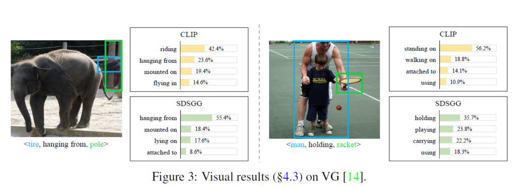 시각화 결과를 살펴보고 논문 마무리하도록 하겠습니다. Fig 3에서는 VG 데이터셋에 대해 CLIP과 SDSGG를 비교하였습니다. 보다시피 제안된 SDD를 활용했을 때 SDSGG가 challenging한 상황에서도 보다 고품질의 relation 예측을 생성하는것을 확인할 수 있습니다.