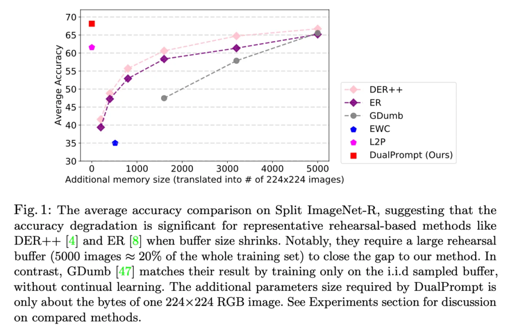 위 Fig1은 기존 모델들의 rehearsal buffer 사이즈에 따른 성능을 나타내는 그래프인데요. 보시면, x축이 buffer 사이즈인데, 이게 커질수록 모델 성능도 같이 올라가는 것을 볼 수 있습니다. 반면 본 논문에서 제안하는 DualPrompt는 기존 rehearsal based 모델들과 달리 리허설 버퍼를 사용하지 않고 prompt를 이용해 sota를 달성했다는 점에서 의의가 있습니다. 이 DualPrompt의 핵심은 task-invariant한, 즉 general한 knowledge를 학습하는 G-Prompt와 각 task마다의 specific한 knowledge를 학습하는 E-Prompt로 개념을 나눠 하용하는 것을 제안한 것입니다.