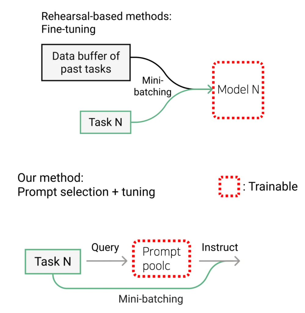 위 그림을 보면 기존 방식과 본 논문 방식의 차이점을 확인할 수 있습니다. 그럼 이제 제안된 DualPrompt에 대해서 method 단에서 자세히 설명드리도록 하겠습니다.